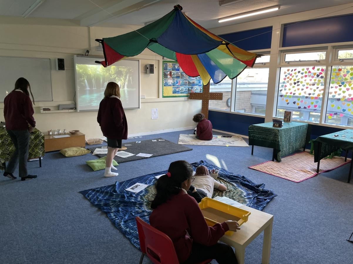 We are fortunate to have the space to create and maintain a dedicated room as a prayer space. The atmosphere is deliberately ‘special’ – children take off their shoes before entering and calming music and images are played. Children really enjoy using the space to reflect on some ‘big’ spiritual questions in a respectful and calming space. It is often hard to be ‘still’ in this busy world and it is wonderful to observe children of all ages enjoying this opportunity and frequently asking if they can visit the room.