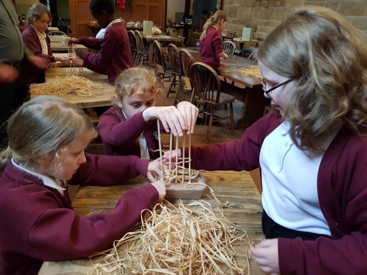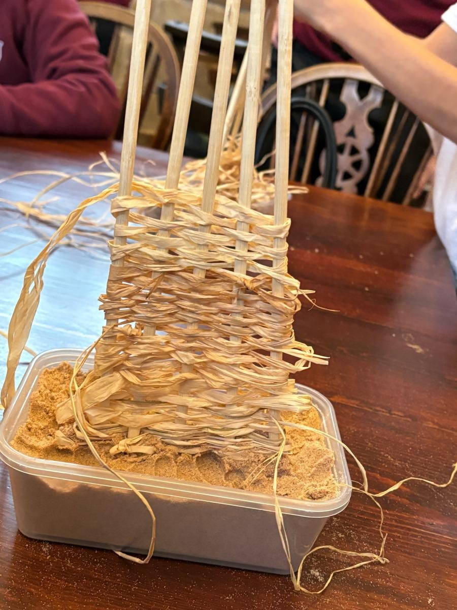 Whilst looking at the materials used to build the Lord Leycester Hospital, we talked about how they were made including the process of using wattle and daub to strengthen the walls. We had a go at a miniature version of wattle and dorb using sticks in sand and weaving straw in and out of them.