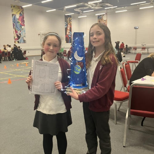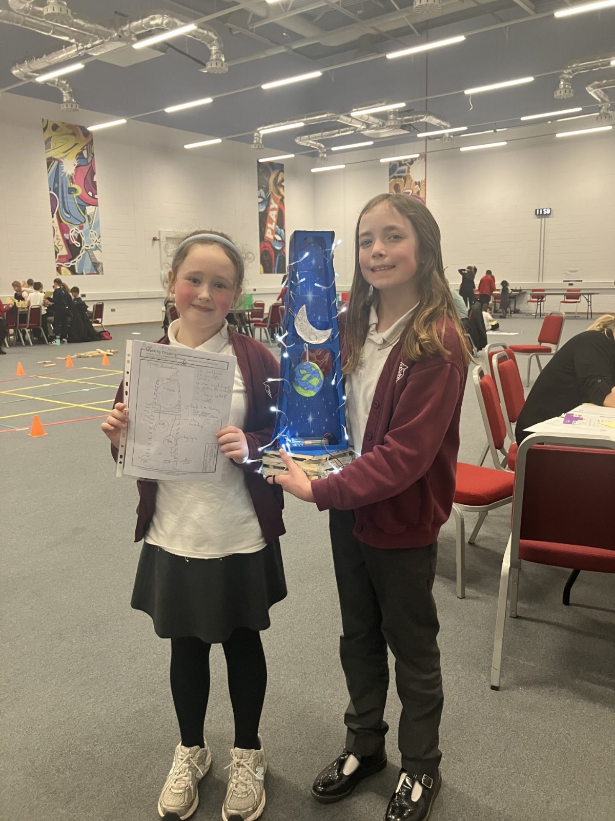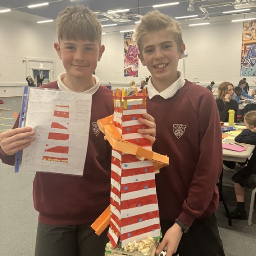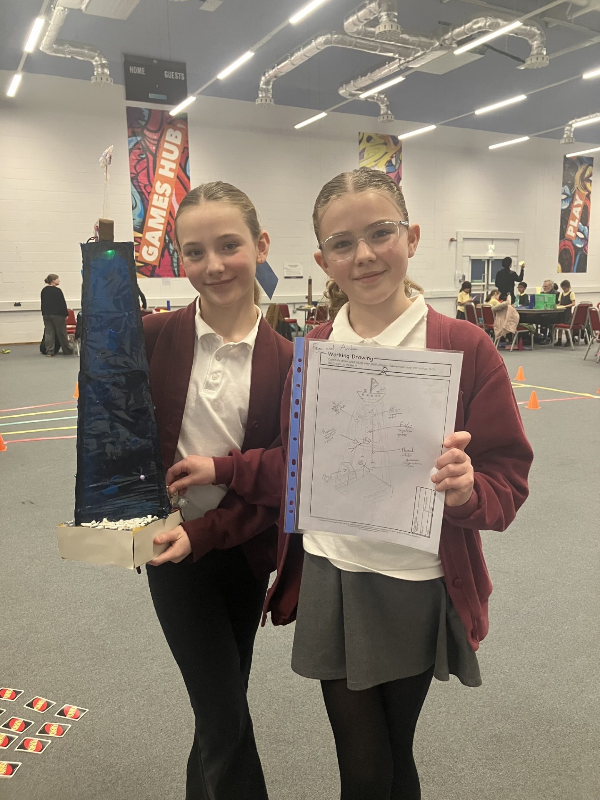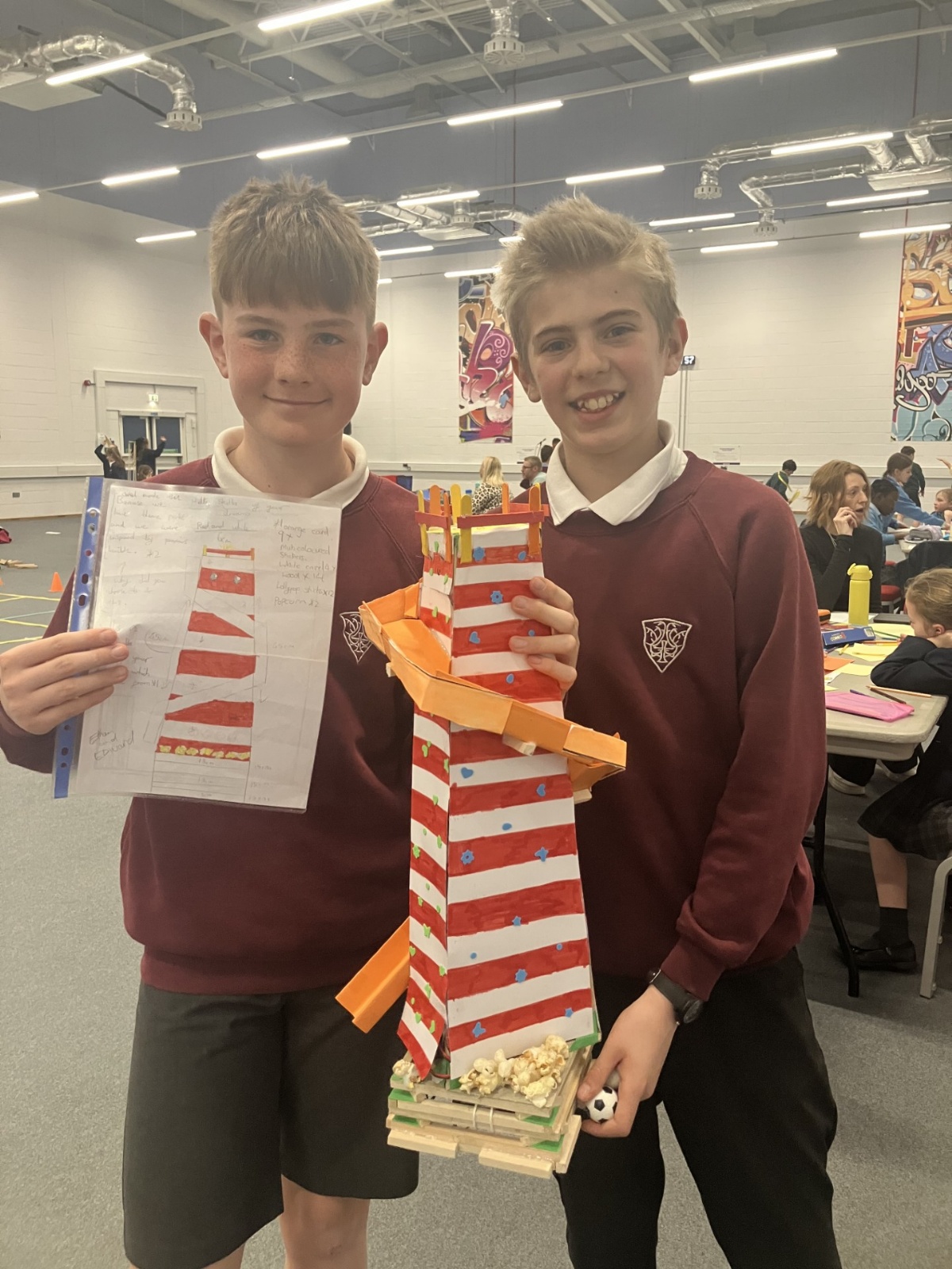 On Tuesday 24th March, eight children (four teams of two) took their finished tower designs to Warwick University for an event that would see their designs put through a tilt test and a shock test. The children also had to sit with a judge and explain their design and theme and why they had chosen them.